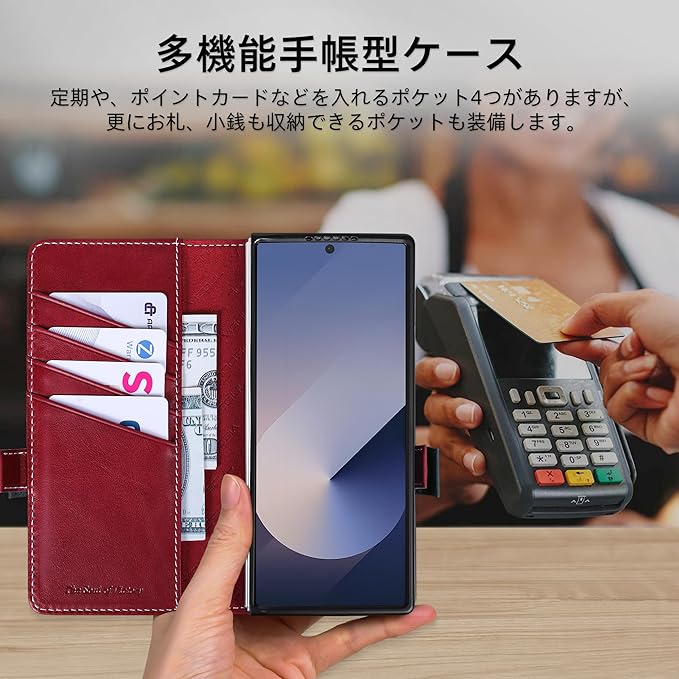 全面保護・携帯ケース対応機種:Galaxy Z Fold 7 対応(8.0インチ)、 ギャラクシー Z Fold 7対応。対応機種と画面サイズをよくご確認のうえ、ご購入いただけますようお願い致します。手帳型ケースの収納ポケットがあり、会社の入館カードや交通系ICのカードにも収納でき、通勤も通学にも楽々タイプです。