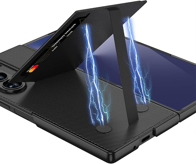 本製品はGalaxy Z Fold7の機構美を革新する次世代ビジネスプロテクション。立体カーボン調デザインと金属質感フレームが品格を演出し、磁気式多機能カードホルダーが利便性を進化。強化ガラス内蔵設計と微隆起保護リップが精密部品を全天候防御する一方、極薄複合構造が端末の本質的な美しさを引き出します。