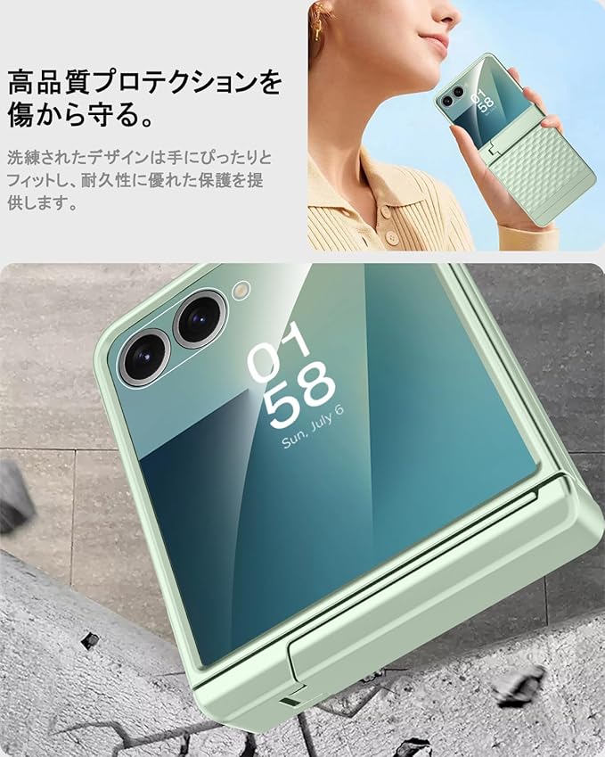 【強化ガラスフィルム付き】このギャラクシーflip 7保護ケースは背面を保護するために9H強化ガラスを使用しており、高い透明度だけでなく、携帯電話を折りたたんだときに背面の小さな画面に傷がつくのを効果的に防ぎます。メッセージの返信、自撮り、ソフトウェアの使用など、快適な操作感と正確なタッチで自由に使用できます。表面層には滑りにくい素材を使用しており、手に汗をかいても滑り難く安心です。