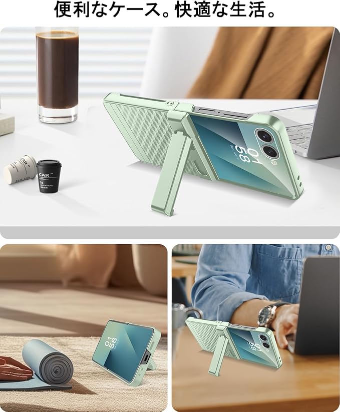 【隠し収納式スタンドヒンジ】このflip 7 Coverには収納可能な折りたたみ式スタンドが付属しており、スタンドを開いて携帯電話をデスクトップに水平に置き、ビデオを見たり、セルフィーを撮ったりすることができます。収納式の折りたたみスタンドは、外出先でも、食事や観戦でも、仕事中でも、キックスタンドを活用することできて、携帯電話の利便性を向上させることができます。