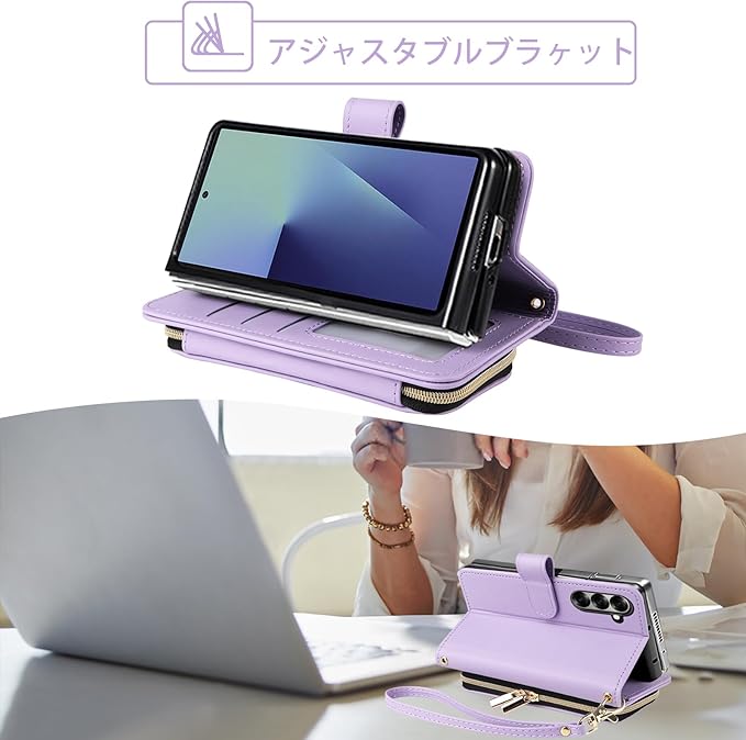 Elisorli for Samsung Galaxy Z Fold 7 手首/ショルダーストラップ カードスロット ジッパー財布 豪華 PUレザー スタンド ための 携帯電話のカバー 持つ ZFold Z7 G Fold7 7Z ウォレットケース しい 大人人気 お洒落 ケース 手帳型 スマホケース カバー スマートフォン 耐久性 耐衝撃 フラップ ストラップホール カード収納 女 むらさき