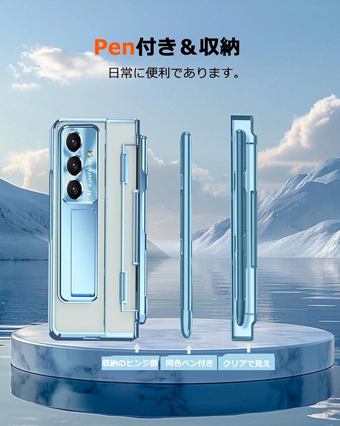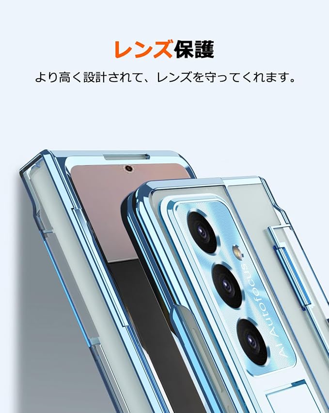 NINKI適応Galaxy Z fold 7ケース 【 SC-56F | SCG34 】 ペン付き penホルダー キックスタンド フィルム一体型 クリア背面 メッキ加工 PC製 おしゃれ 折り畳み式 サムスン ギャラクシー フォールド 7 5g スマホ ケース(ブルー)