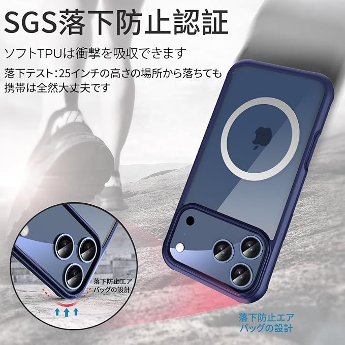 [軍用級360 全身保護]17 Pro Max Magsafe ケースはSGSの落下防止認証を取得し、両面強化ガラスとソフトTPUバンパーで作られています。 17 Pro Max Magsafe ケースは全面的な保護ができて、取り付け方も簡単です。16のスクリーンに傷つかないように 、17 Pro Max Magsafe ケースの内側にはガラススクリーンを保護するフィルムがあります。17 Pro Max Magsafe ケースには4つのエアクッション緩衝角があり、超薄型エアクッションで衝撃を減弱する技術を採用し、落ちる時の損害を防ぐことができます。