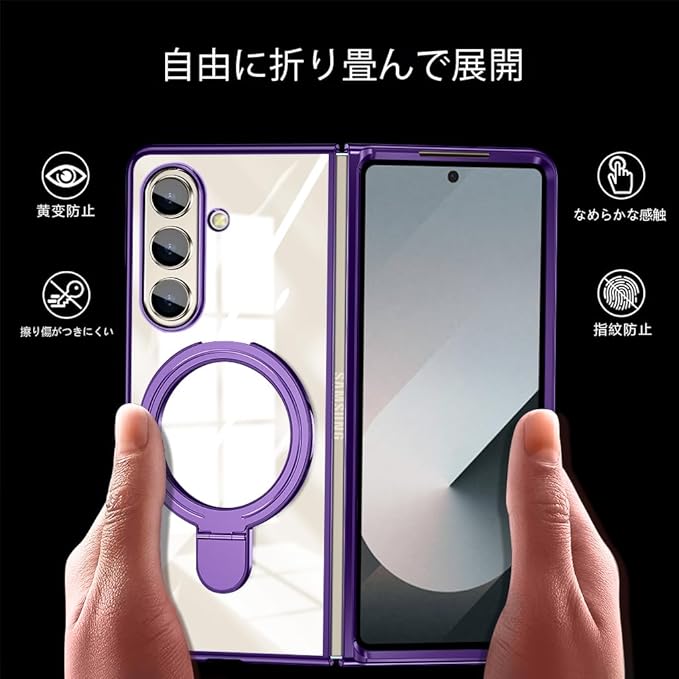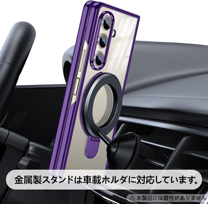 Galaxy Z Fold7 対応 ケース リング付き クリア メッキ加工 耐衝撃カバー スタンド機能 車載ホルダー PC 透明 軽量 電気メッキ 折りたたみ おしゃれ 一体型 ワイヤレス充電 ハード ギャラクシーZ フォールド7 5G 対応 スマホケース 紫 JP11-48
