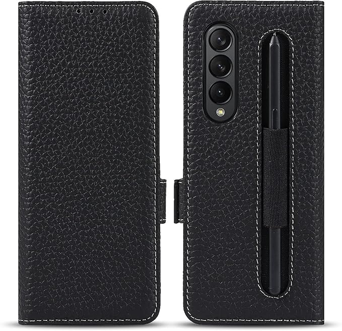 for Galaxy Z Fold3 5G ケース SC-55B SCG11 手帳型ケース Sペン収納付き 手作り柔らかい 牛革製品 本革レザー Pelanty サムスン ギャラクシー Z フォールド3 5g 携帯カバー ペンホルダー 財布型 カード収納 スタンド機能 内蔵マグネット 耐衝撃 [ブラック]