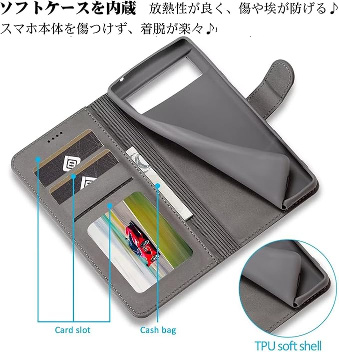 【高級PUレザーメ 柔らかいTPU】肌感PUレザー +柔軟なTPUカバーと組み合わせ、厳選された革を採用しており、目に見える高級感と抜群な、肌のような手触り感、長時間使っても、手に汗が出てもケースは変なにおいが出てきません。スマホ本体はめ込み部分はな柔らかいTPU(シリコン)ケースです。TPU素材を使用したソフトカバーにより、軽量と耐衝撃を兼ね備えました。また、柔らかいTPUカバーは取り付け・取り外しが簡単で、スマホ本体への損傷の心配ありません。