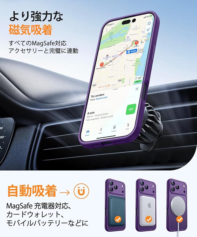 【強力なマグネット吸引力】MagSafe対応 及び Qi ワイヤレス充電器に対応。マグネット式ウォレット、ポータブル充電器、カーマウントなどのアクセサリーと安定的に接続し、回転や移動時も脱落しません