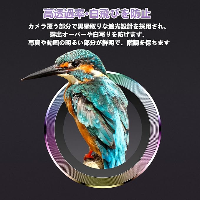 【3D全面保護】 アルミ合金+9H硬度ガラス素材を使用し、高級感を高めているときに質感を向上させます。カメラのデザインよりも高く、スクラッチ防止し、カメラレンズを衝撃や通常の損傷から保護します。スマートフォンを落とした場合でも、保護フィルムが側面からの衝撃を吸収し、カメラレンズへの傷や衝撃を最大限に防ぎます
