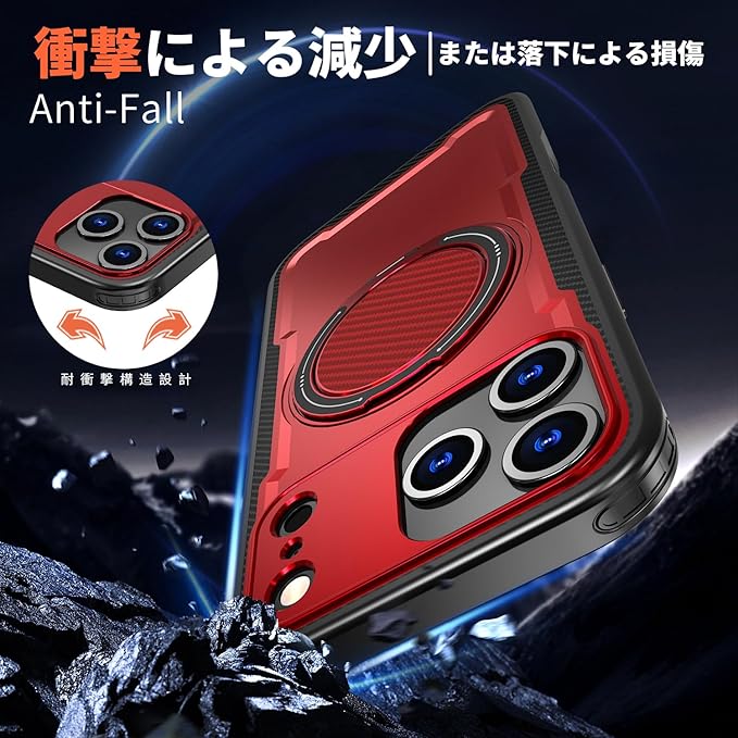 iPhone 17 Pro Max 用 ケース 耐衝撃 スタンド付き MagSafe対応 米軍MIL規格 いPhone 17 Pro Max カバー ワイヤレス充電 防指紋 縦横両対応 360 回転スタンド 炭素繊維テクスチャ ファッション レッド 121-IP17PM-03