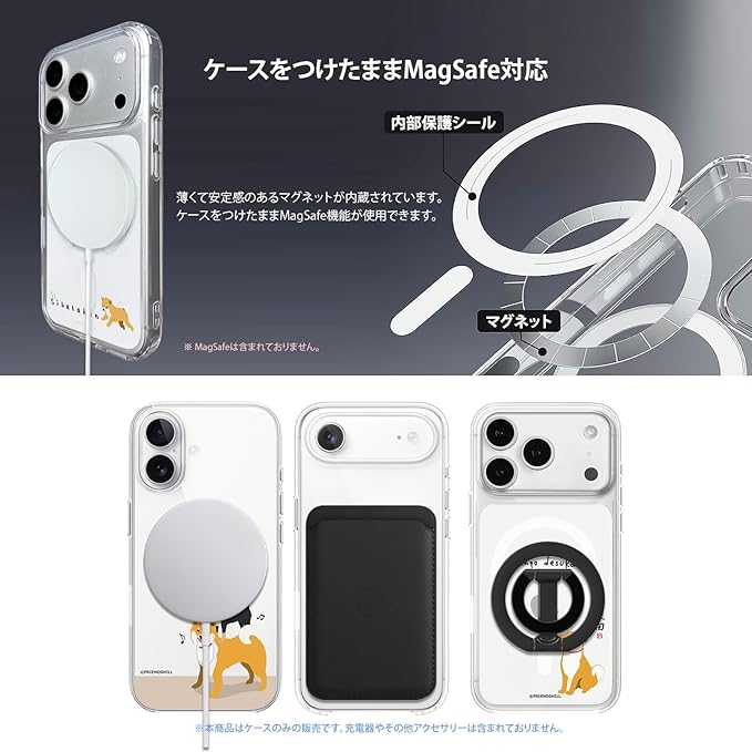 abbi FRIENDS(アビィフレンズ)の「しばたさんMagSafe対応クリアケース」は、「しばたさん」公式ライセンスのハイブリッドクリアケースです。ケース背面にはマグネットリングを搭載し、MagSafe対応アクセサリーをそのまま使用可能です。