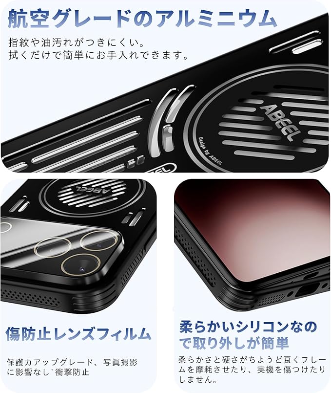 【対応機種】iPhone 17 Pro Max 専用に設計されています。 他のモデルには対応していません、対応機種を十分ご確認ください。製品に不具合が生じた場合は、【出品者に連絡】をクリックして弊社宛まで直接にお問い合わせ下さい。お客様からのお問い合わせ内容に応じて商品交換・返品可能です。【航空用アルミニウム合金製ケ一ス】耐久性のある航空アルミニウム合金製で、一体型の保護ゴムパッドを備え、デバイスを損傷することなく強力な耐衝撃保護を提供します。薄型超軽量仕様ので、手に持っても重さを感じることが無い。ファッション性と実用性をを兼ね備えたデザインです。【放熱冷却機能】ケース 放熱メッシュ構造、長時間の使用で熱くなったアイフォンを効果的に冷却できます。この効果は、メッシュ構造によりエアフローを促進しiPhoneから出る熱の拡散を促進します、放熱を促すことによって得られ、iPhoneの動作パフォーマンスにも良い影響を与えま。ゲーミングスマホの愛好家やブロガーにオススメします ゲーミングスマホケース。【Magsafe対応】マグネットが内蔵されている、MagSafe充電に対応しており、ケースを装着したままでもワイヤレス充電が可能。MagSafeアクセサリーともスムーズに連携でき、日常使いがさらに快適になります。【フルレンズ保護フィルム付き】カメラレンズ一体型保護膜を内蔵。傷つきにくく、汚れに強く、落としても割れにくい安心設計。背面パネルには高強度アルミ合金を採用し、耐久性と高級感を両立。ケースの四隅に衝撃を吸収するエアバッグデザイン、頑丈な構造で、優れる耐衝撃性能。