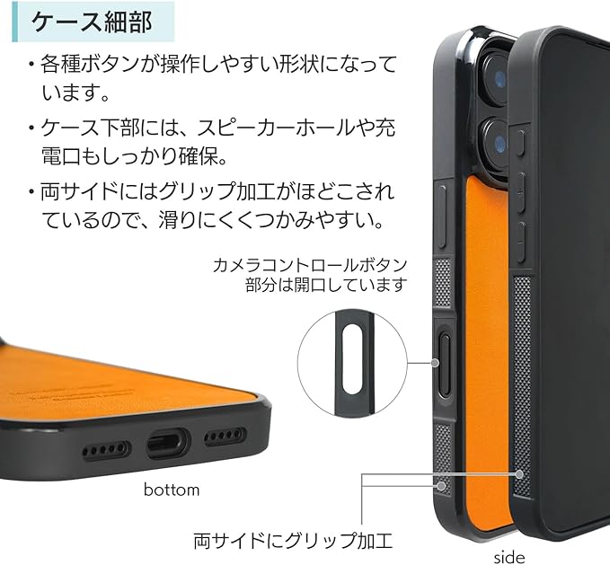 【 カメラ・液晶を保護 】 デスク等に置いた際にカメラや液晶が接地面と直接触れないように、液晶側の側面・カメラ周りがわずかに高くなっています。 / 【 グリップ性 】 両サイドに滑りにくいグリップ加工を施し、安定した持ちやすさを確保。 / 【 操作性・機能性 】 ボタンは押しやすい形状に設計され、スピーカーや充電口も確保。