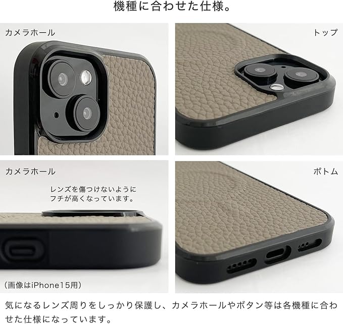 【仕様】ケース背面にMagSafe用マグネットリングが内蔵されているので、MagSafe充電器やMagSafe対応アクセサリーを装着することが可能です。ケース本体は耐候性や耐熱性に優れたポリカーボネートを採用し、高品質の素材でスマートフォン本体をしっかり保護しています。側面は柔軟性が高く傷に強いTPUを使用。ボタンを覆うフルカバーの仕様になっており、両サイドにグリップ加工が施されているので持ちやすく滑りにくくなっています。背面はシュリンクレザーを丁寧に貼り込み仕上げています。