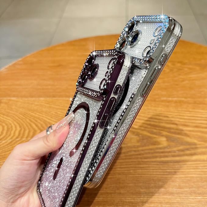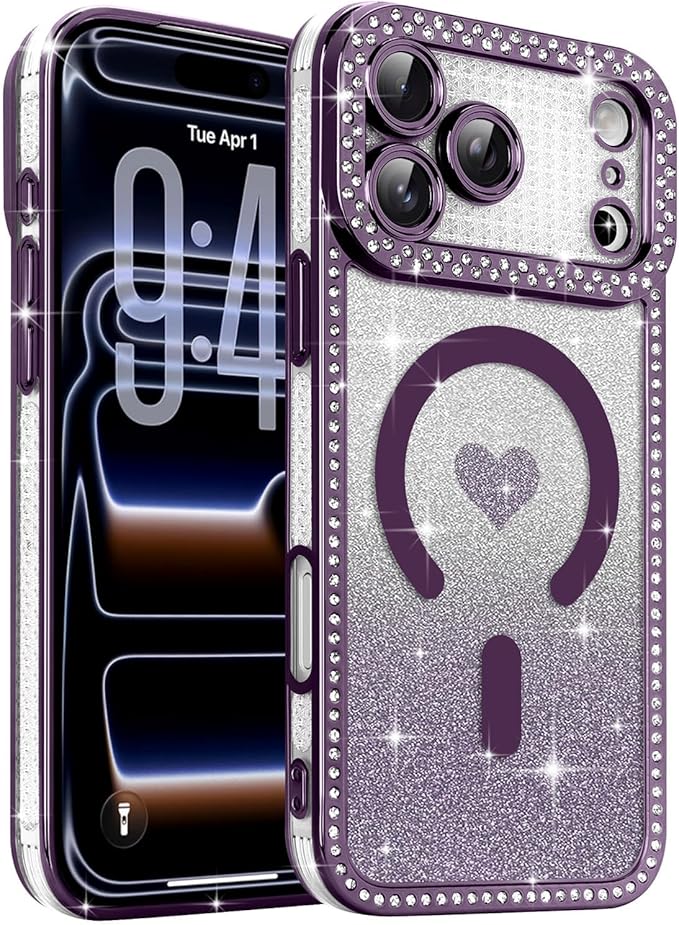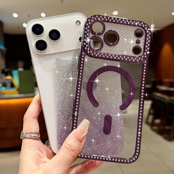 Lafunfa iPhone 17 Pro Max 用 ケース MagSafe対応 かわいい 女の子 キラキラ 透明 マグネットカバー [グリッターカード付き] ハート柄 グラデーション 光沢 ダイヤモンド 軽量衝撃吸収 [フルカメラ保護] ワイヤレス充電 アイフォン 17 Pro Max 用 スマホケース パープル