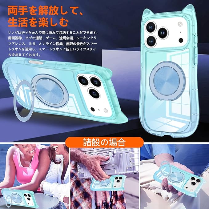 iPhone 17 Pro Max 用 ケース グラデーション 多機能360度回転スタンド 縦横両用 マリング付き [MagSafe 対応] アイフォン17promax スマホケース 可愛い 猫耳 ネコミミ 耐衝撃 滑り止め 黄ばみなし 薄型 軽量 全面保護