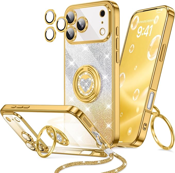 iPhone 17 Pro Max ケース ダブルリングスタンド リストバンドブレスレット付き レンズ保護 グリッターカード プレミアム クリア レディース 高級 可愛い ハートデザイン 薄型 軽量 iPhone17 Pro Max 用 スマホケース, 6.9", ゴールド