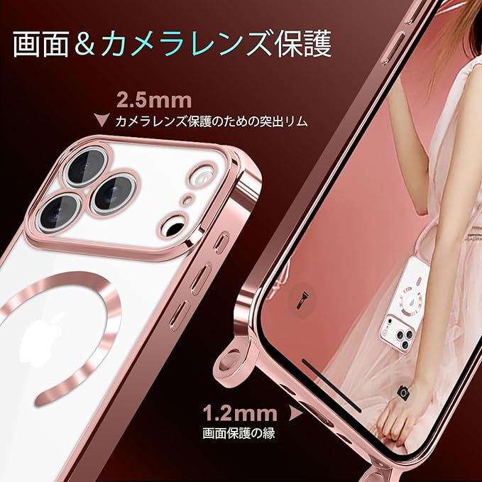 Lafunda iPhone 17 Pro Max 用 ケース クリア MagSafe対応 ショルダー スマホカバー 透明 肩掛け 斜めかけ 縄掛け TPU 薄型 おしゃれ マグネット搭載 耐衝撃 落下防止 長さ調整可能 ワイヤレス充電 アイフォン 17 Pro Max 用 携帯スマホケース ストラップ付き (ピンク)