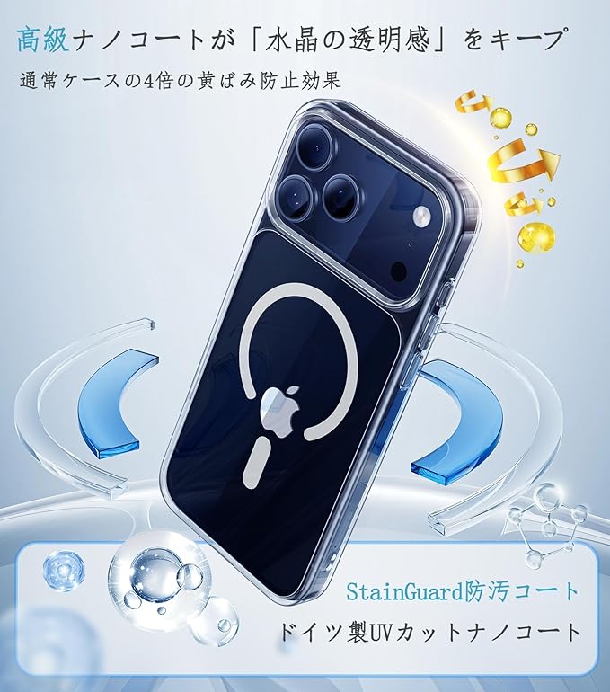 【iphone17 pro max ケース MagSafe 最適化設計&黄ばみ防止技術】高感度カメラボタンで、iphone 17 pro max ケース装着したまま撮影から精密なフォーカス制御まで可能。クリック/スライドの直感的操作がスナップ速度を向上。1500 ガウスの強力磁芯を内蔵。MagSafe 充電器 / カーマウント / マグネットウォレットなどのアクセサリーと確実に吸着し、15W 高速充電を完全サポートします。悪路や通勤時の振動でも脱落しにくく、安定性は業界トップクラスです。iphone 17pro maxケースはドイツ開発のPC素材を採用します。さらに、耐油・耐UVナノコートと「StainGuard」防汚コートを表面に施すことで、汗、皮脂、紫外線による黄ばみを強力に抑制します。その効果は一般的なあいふおん17 ケースの約4倍。日光曝晒や液体への耐性が実証されており、長期間にわたり美しい透明感を維持。指紋がつきにくく、あらゆるシーンでクリアな見た目と上品な印象を叶えます。