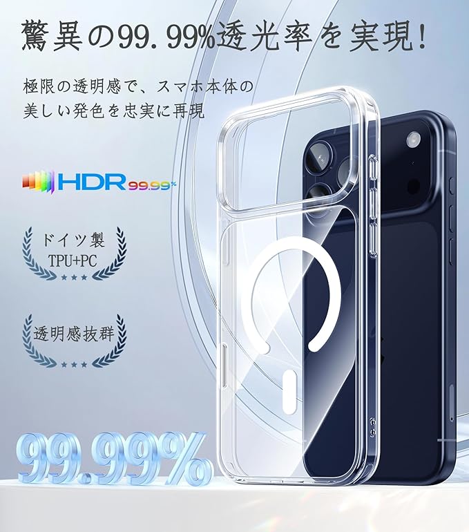 【99%超高透過で裸機の美を再現】iphone17pro max ケースは、高純度PC素材を採用。業界トップクラスの透明度を実現しました。装着時でも、装着していないかと見間違うほどのクリアさで、いphone17pro max ケースの洗練されたチタンカラーの上品な輝きまで、ありのままに忠実に再現。スマホの魅力を損なわず、長期間使っても輝きと透明感が持続。さらに、ワイヤレス充電もそのままお使いいただけ、便利な毎日をお届けします。