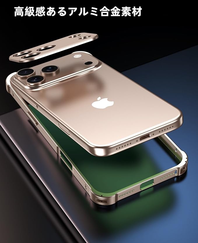 アルミ合金カメラ枠付き- カメラ枠には耐久性と高級感に優れたアルミ合金素材を使用。落下や衝撃からレンズ部分をしっかりガードし、さらに美しい光沢がデザインのアクセントにもなっています。