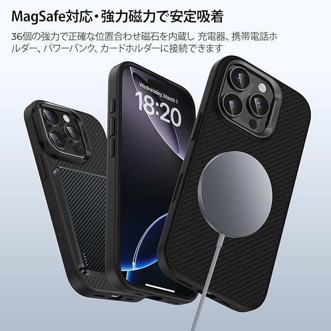 【フルカバー保護設計|精密フィット】高耐久アラミド繊維とTPU素材を組み合わせた構造により、iPhone 16 Pro Maxを全面保護。ポート・スピーカーに対応した精密カットアウトで、操作性を損なうことなく快適に使用できます。