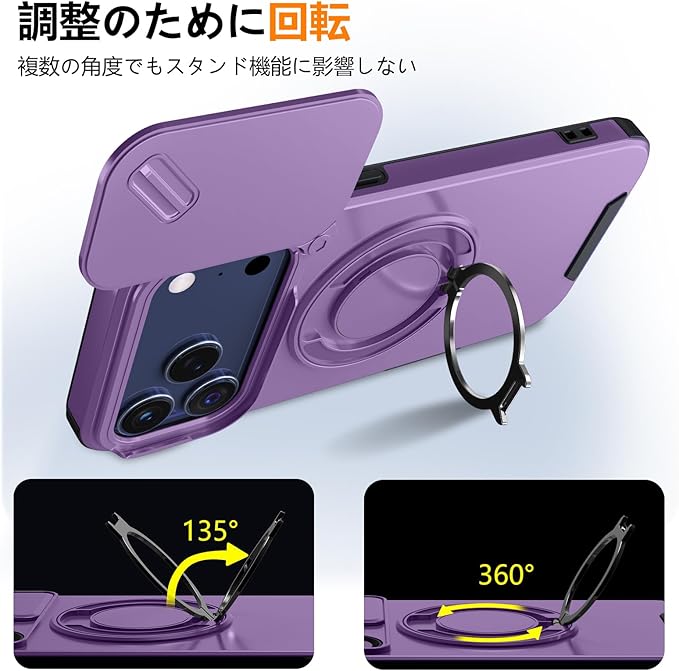 対応 iPhone 17 Pro Max 用 ケース リング付き スライド式カメラカバー 隠しスタンド 耐衝撃 スタンド機能 縦横両対応 車載ホルダー PC TPUバンパー 防塵 人気 落下防止 滑り止め 指紋防止 アイフォン 17 プロ マックス カバー 紫 MJJ-1065-16-04