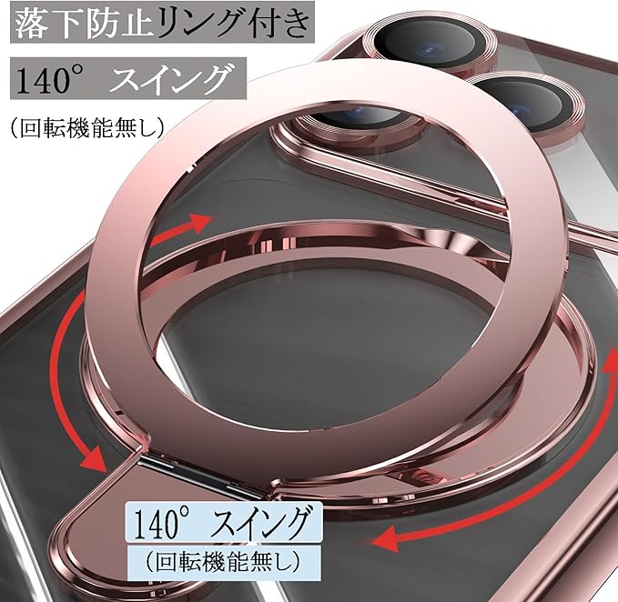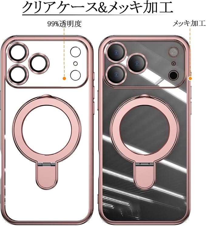 スマホケース 対応 iPhone 17 Pro Max ケース MagSafe対応 クリア 透明 リング付き メッキ仕上げ レンズカバー付き ソフトTPU 耐衝撃 傷に強い背面 ワイヤレス充電 ストラップホール付き アイフォン17プロマックス 磁気カバー (ローズゴールド, 17Pro Max)