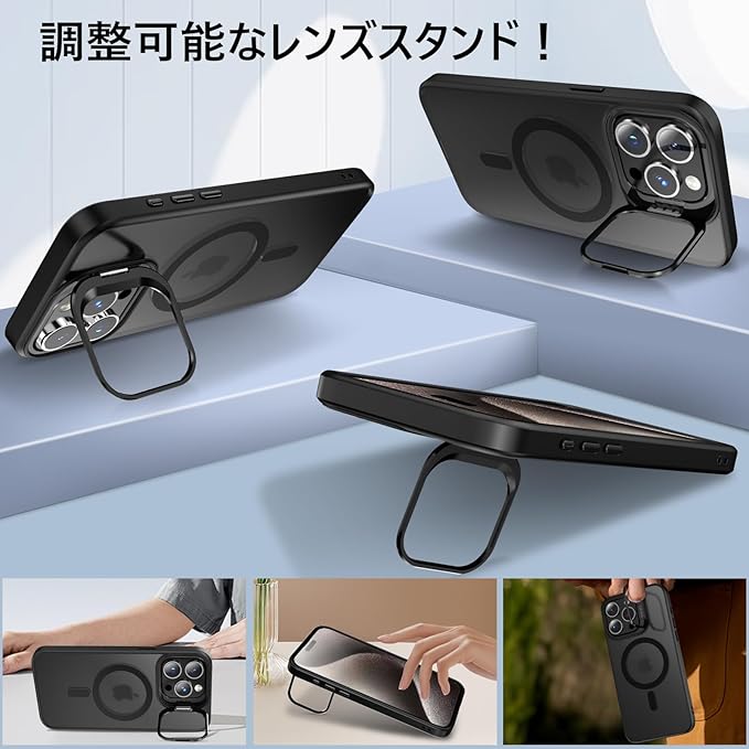 iphone 15 pro max 用 ケース レンズスタンド付き 角度調整可能 アイフォン 15 pro max ケース Magsafe対応 いphone 15promax カバー 米軍MIL規格 耐衝撃 スマホケースiphone15 プロマックス カメラスタンド 軽量 スマホカバーiphone15プロマックス マット仕上げ 半透明 黄変防止 6.7インチ ブラック SHANGHAO