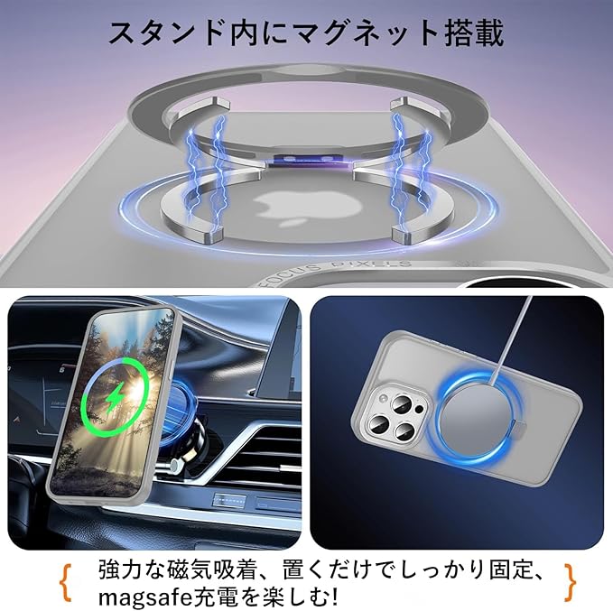 【Magsafe対応】背面に薄くて強いマグネット内蔵しています、ワイヤレス充電や車載ホルダーやアクセサリとのあらゆる充電に安定で接着ができ、差し込みのいらないより簡単により素早く充電できます。