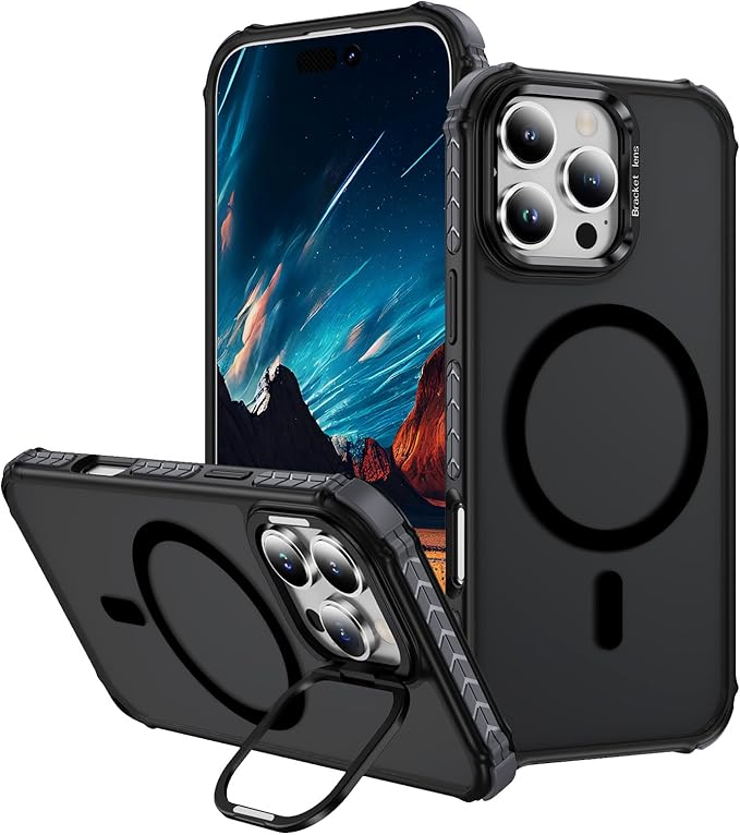 iPhone 16 Pro Max 用 ケース MagSafe対応 耐衝撃保護 金属製カメラスタンドとメタルボタン付き プロテクターカバー (ブラック)