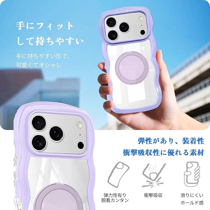 【全方位保護】ケースのカメラ部分は、 あいほん17 Pro Max のカメラレンズよりも高い位置に設定されており、レンズを傷から守ります。また、波型のエッジにはある程度の厚みを持たせているので、万が一 いphone 17 Pro Max を落下させてしまった場合でも、通常のケースよりも全方位的に大切なレンズと画面を保護します。