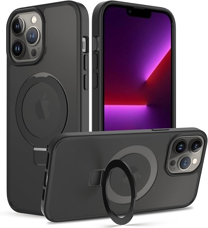 iPhone 13 Pro Max 用 ケース 隠し収納式 Magsafe対応 アイフォン 13 Pro Max ケース マグネット搭載 リング付き 多機能スタンド 縦横両対応 スタンド内蔵 半透明 耐衝撃 カバー (ブラック, iPhone 13 Pro Max)