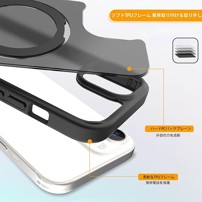 【MagSafe対応】ケースをつけたままマグセーフ機能を快適に使用できます。背面に薄くて強いマグネット内蔵しています、ワイヤレス充電や車載ホルダーやアクセサリとのあらゆる充電に安定で接着ができ、差し込みのいらないより簡単により素早く充電できます。