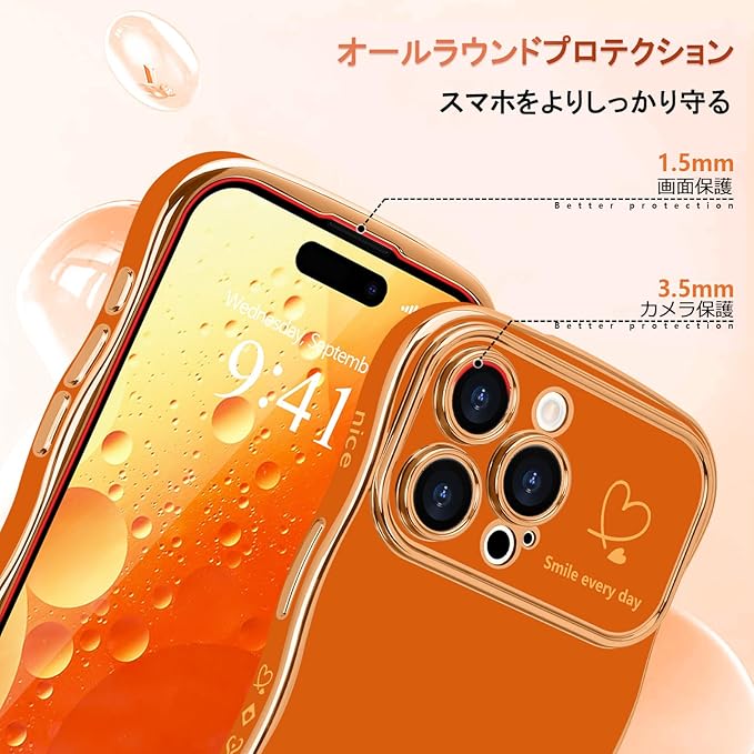 【おしゃれで握りやすいデザイン】 ウェーブ状の湾曲縁が特徴的なデザインは、見た目のおしゃれさだけでなく、驚くほど安定したグリップ感を実現。背面の電鍍メタリックフレームと大きなハートウィンドウが、可愛らしさと洗練された印象を添えます