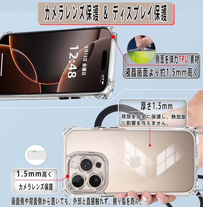 iPhone 16 Pro Max 用 ケース アイフォン16プロマックスケースショルダー【ストラップ2枚付き】肩がけ 首掛け 紐付き 斜めがけ スマホケース いphone16pro max 薄型 透明 軽量 シリコン TPU バンパー ストラップホール付き [耐衝撃 傷防止 レンズ保護 米軍MIL規格]ワイヤレス充電対応 アイフォン16ProMax カバー (クリア)