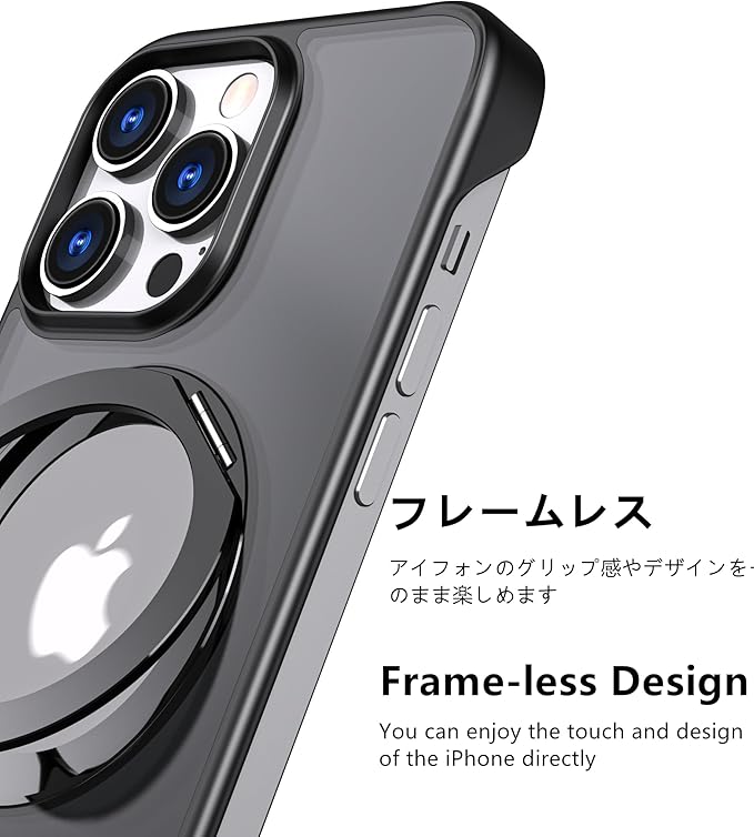 iPhone 15 Pro Max 用 ケース 【多機能360 回転 スタンド】【MagSafe対応・隠しスタンド】丸型スタンド付き 半透明 マグネット搭載 ワイアレス充電対応 【フレームレスデザイン】縦横両対応 角度調整 アイフォン 15promax 用 ケース(iPhone 15 Pro Max, 黒)