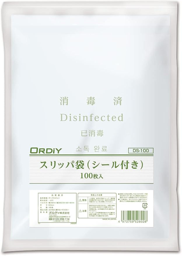 オルディ 消毒済 スリッパ袋 シール付き 使い捨て 透明 100枚入 4ヵ国語表記 ホテル客室用 業務用 日本製 DS-100
