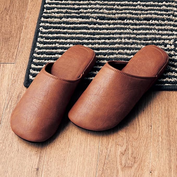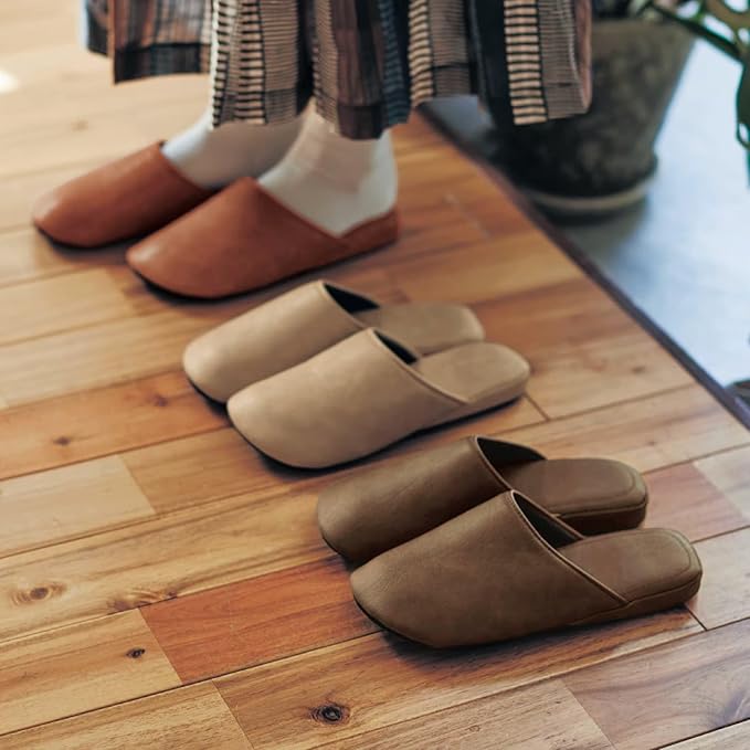 汚れが拭けるから、キッチンや水回りにも ●今までありそうでなかった、合皮のシックなスリッパ ●汚れがついてもサッと拭き取れいつもキレイに保てます ●キッチン使いにうれしい ●色ムラやシワの質感が、高級感のある雰囲気 ●裏面はすべりにくく足音も控えめ ●甲が合皮でさっと拭いてお手入れでき、トイレ用のスリッパとしてもおしゃれ。 ●ペットの抜け毛がつきにくい合皮素材を使用 ●粗相をされても気兼ねなく洗濯機で洗える