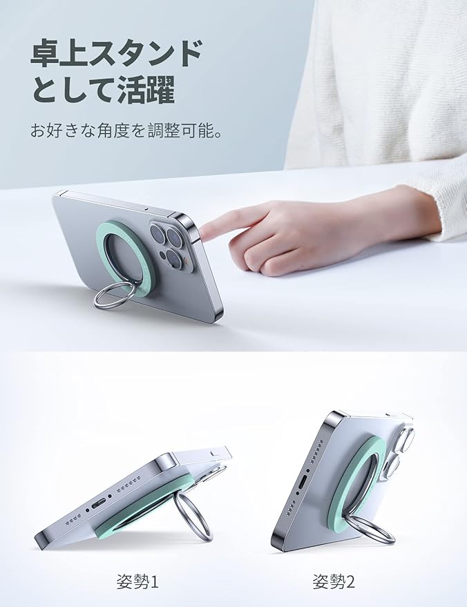 【強力磁力でしっかりと吸着】約1000gまでの荷重に耐える強力磁力です。iPhone 17/16/15/14/13シリーズをしっかりと吸着できます。マグネット式スマホリングで、iPhone MagSafe シリーズ本体やMagSafe搭載ケースに簡単に装着できます。また、マグネットなので跡を残さず取り外し可能です。テープ跡や糊残りを気にせずお使いのスマホをきれいな状態でご利用いただけます。