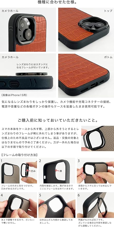 【仕様】ケース背面にMagSafe用マグネットリングが内蔵されているので、MagSafe充電器やMagSafe対応アクセサリーを装着することが可能です。ケース本体は耐候性や耐熱性に優れたポリカーボネートを採用し、高品質の素材でスマートフォン本体をしっかり保護しています。側面はスムーズに着脱ができるシリコンでボタンを覆うフルカバーの仕様になっており、下部にストラップホールが付いています。※丸ひもタイプのストラップ付属(カラーはブラック) 背面は栃木レザーを丁寧に貼り込み仕上げています。 【スタンド機能】レンズまわりのフレームをスマホスタンドとして使用できます。※カメラホールにスタンド機能付きのフレームを付けているので、カメラホールの形状は機種に関わらず正方形となっております。