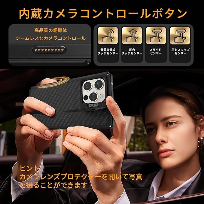 高級素材:背面カバーに本物のカーボンファイバーを使用し、軽量のアルミニウム金属フレームを採用した iPhone 16 Pro Max ケースはユニークで傑出したものになります。