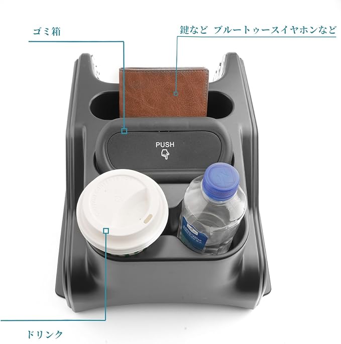 【多機能設計】カップホルダー+収納ボックス+ミニゴミ箱の便利な三位一体デザイン。飲み物、スマホ、小銭、駐車券カード、コイン、メガネ、クレジットカードや鍵などの小物をすっきり収納可能。小物関係の収納には最高です。さらにゴミ箱付きで、車内を清潔に保つ習慣が自然に身につきます。