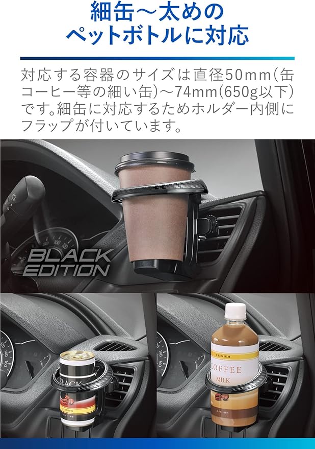 フラップ付きで、コンビニコーヒーなどのカフェカップや缶、ペットボトルに対応(直径50~74mm)
