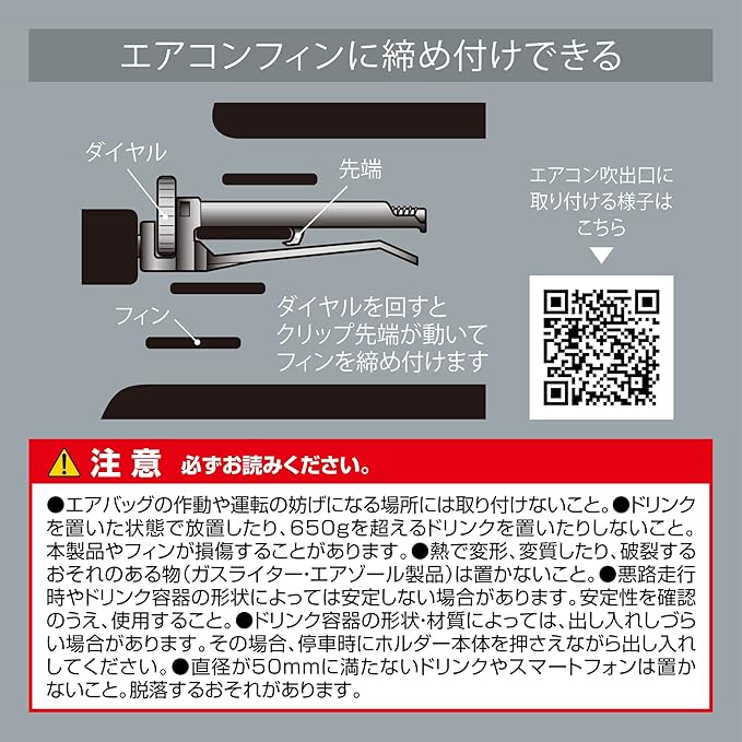 エアコンフィンに取付けるタイプのドリンクホルダーです。製品にはエアコンフィンに締め付けて固定できるクリップが付属、クリップのダイヤルでどのような奥行きのフィンでもガッチリと固定ができます。