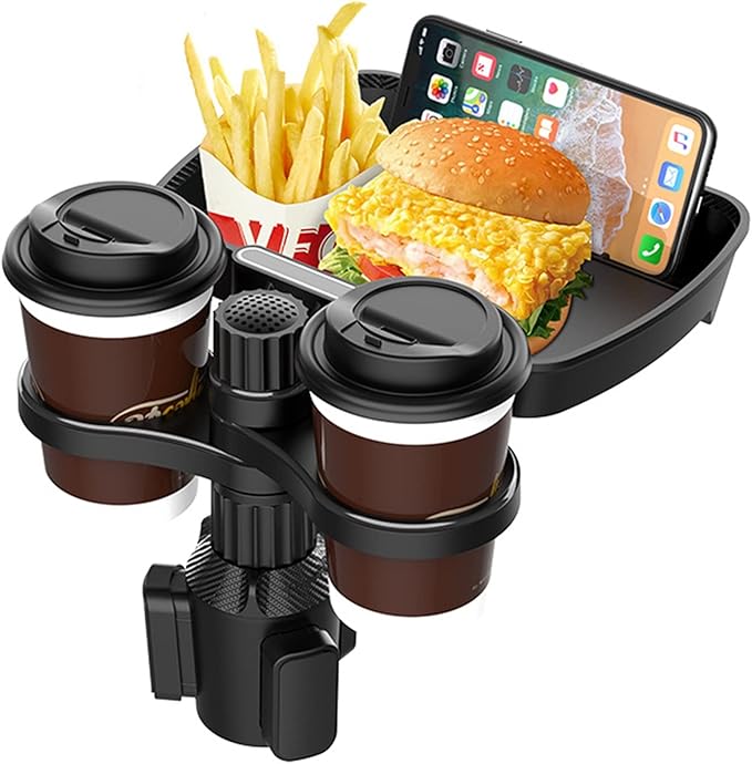 2-in-1車用カップホルダーです。2-IN-1省スペース設計で2つのドリンクカップ、小物やフードを置けるトレイが装備され、スマホも立て掛けられる多機能カップホルダーです。360 回転機能に手が届きやすい位置に調整可能です。直感的な作業性、能率的で車内スペースを有効活用できます。