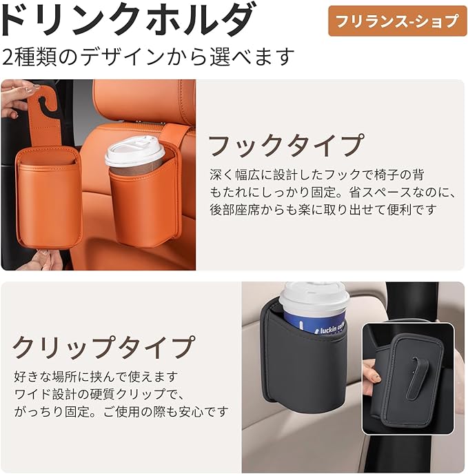 【2つの装着スタイル】フック式とクリップ式の2タイプ。フック式はシートヘッドレストに掛けるだけでスペースを有効活用でき、ドリンクを手の届きやすい位置に配置可能。クリップ式はシートサイドやヘッドレスト下部にしっかり固定可能。ワイドで堅牢なクリップ設計で、走行中も安定して保持します。