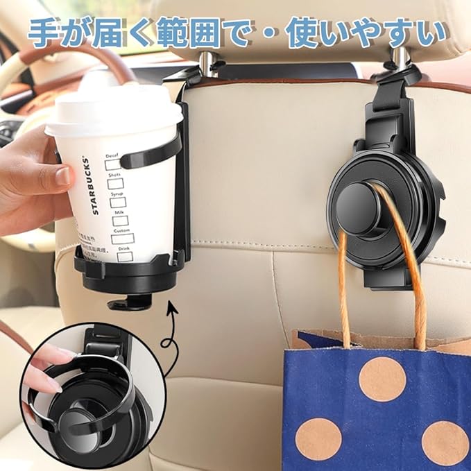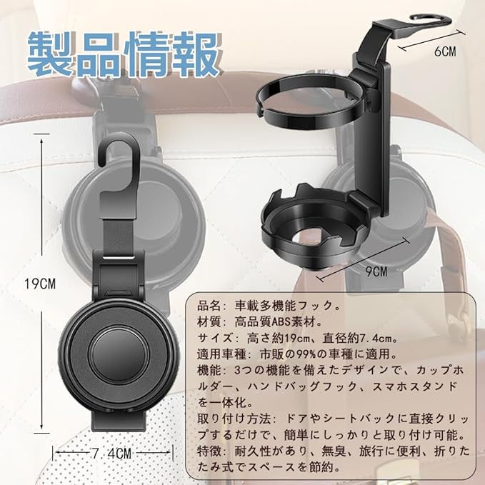 多機能カーフック車用フック 2個セット 3in1 折り畳み式車用 ドリンクホルダー 車 カップホルダー 車のシートバック用ヘッドレストフック 電話ホルダー ハンギングハンドバッグ傘用 収納 車用フック 簡単取付 ブラック