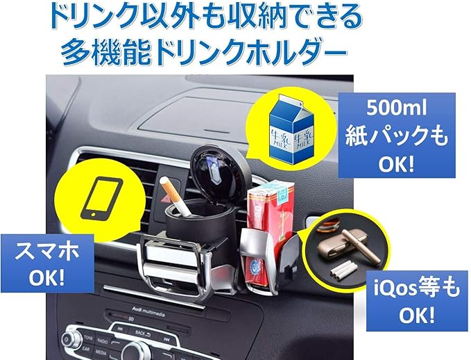 多機能タイプのドリンクホルダーです。これ1つでペットボトルや500mlの紙パックの他、スマホやたばこ等を置くことができます。