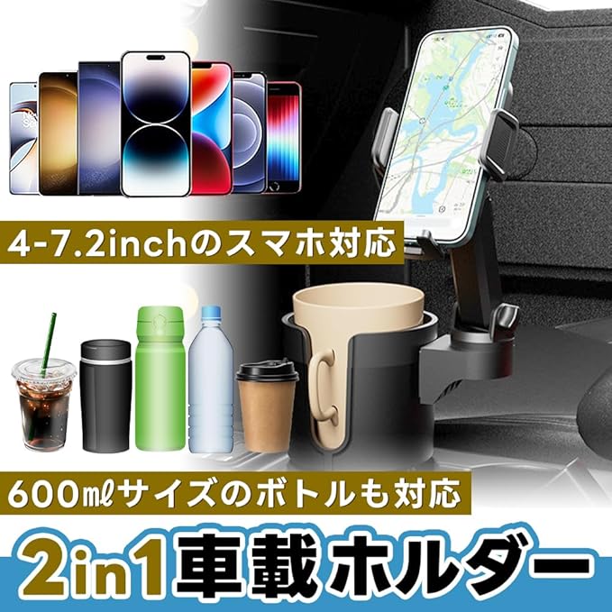 Novelia スマホ&ドリンクホルダー 2in1デザイン 車載用 ズレにくい 幅調整 360度回転 ワンタッチ カー用品