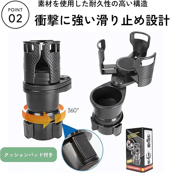 【安定性抜群・衝撃に強い滑り止め設計】クッションパッド付きで振動をしっかり吸収し、車の走行中でもドリンクを安定して保持。ABSとPC素材を使用した耐久性の高い構造で、衝撃にも強く、長期間使用可能。車内での使用はもちろん、オフィスや自宅でも活躍する万能ホルダーです。